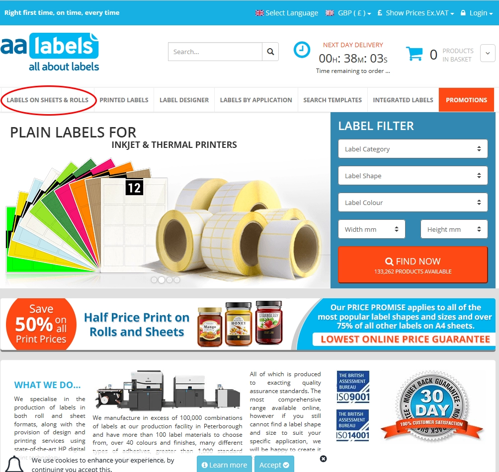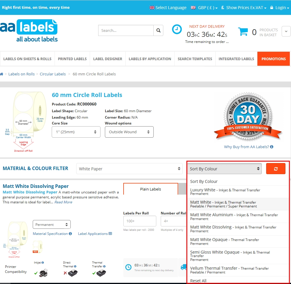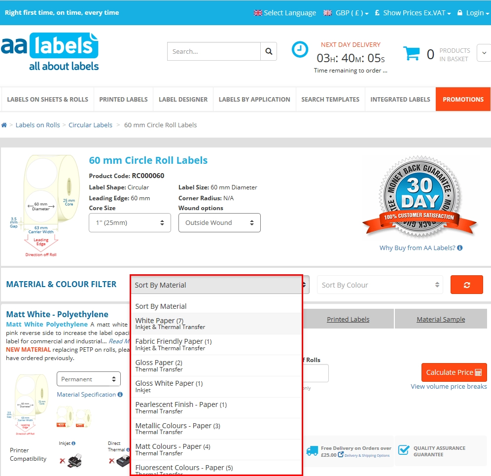 Vous pouvez ensuite utiliser le filtre d'étiquettes montré plus haut pour choisir la forme et la taille de l'étiquette et procéder comme décrit précédemment pour sélectionner le matériau, la quantité d'étiquettes et le nombre de rouleaux.