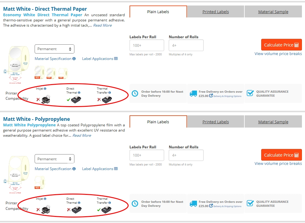 Lors d'une recherche par imprimante thermique pour la sélection d'étiquettes, la compatibilité de l'imprimante sera indiquée dans le résumé en haut de la page (Fig. 09), mais dans tous les cas, les différentes méthodes de recherche convergeront vers la page des matériaux où il existe un autre contrôle de compatibilité d'imprimante disponible via les icônes d'imprimantes (Fig. 10).