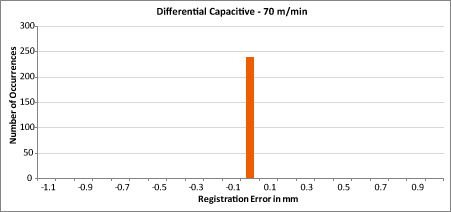 Les tableaux ci-dessous montrent l'emplacement (le repérage) de 240 étiquettes consécutives détectées par différents capteurs. Une seule barre au centre de chaque graphique indique que les 240 étiquettes ont été placées avec une précision de ± 0,05 mm. D'autres barres indiquent combien d'étiquettes ont été placées différemment (selon la hauteur de la barre) et dans quelle mesure elles ont varié (à quelle distance les barres se trouvent du centre du graphique).